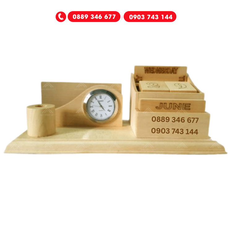 Quà tặng gỗ để bàn: Bao gồm lịch gỗ, khay đựng bút, đồng hồ gỗ hoặc kệ điện thoại. Các mẫu quà tặng gỗ để bàn không chỉ hữu ích mà còn mang lại sự sang trọng cho không gian làm việc.